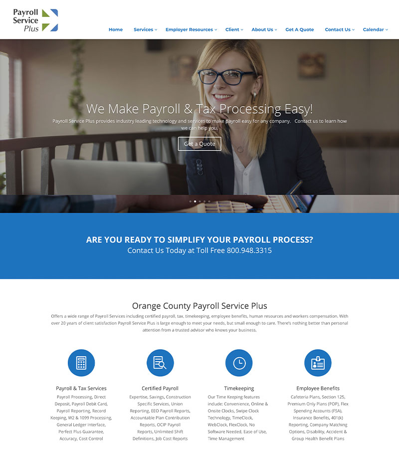 Offers a wide range of Payroll Services including certified payroll, tax, timekeeping, employee benefits, human resources and workers compensation. With over 20 years of client satisfaction Payroll Service Plus is large enough to meet your needs, but small enough to care. There’s nothing better than personal attention from a trusted advisor who knows your business.