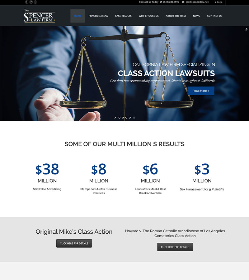 Founded in 2000 by attorney Jeffrey Spencer, we have obtained an aggregate settlement value of over $120 million for our clients. Many of these cases have involved complex litigation against some of the largest corporations and law firms in the country. Our firm litigates cases in Orange County, San Diego, Los Angeles, San Francisco, San Jose, Oakland, San Bernardino, Riverside and throughout the State of California.