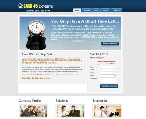 James Marta & Company is a full service CPA firm that can help you with your GASB 45 filing. We specialize in the alternative measurement method for agencies with less than 100 employees.