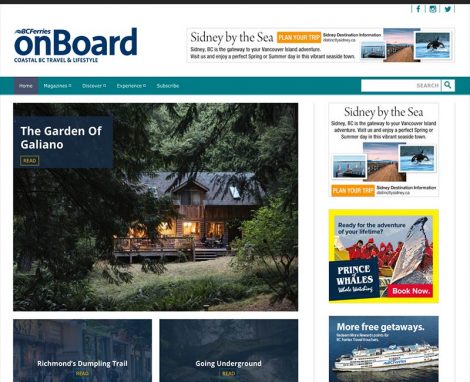 OnBoard is an annual coastal travel and lifestyle magazine and website with engaging editorial content penned by top travel writers. Content focuses on the intriguing communities, people, experiences, history and wildlife in the region served by BC Ferries. With 20 million passengers annually, BC Ferries is among the world’s premier marine transportation systems — and onBoard is your way to be part of the peak coastal travel season.